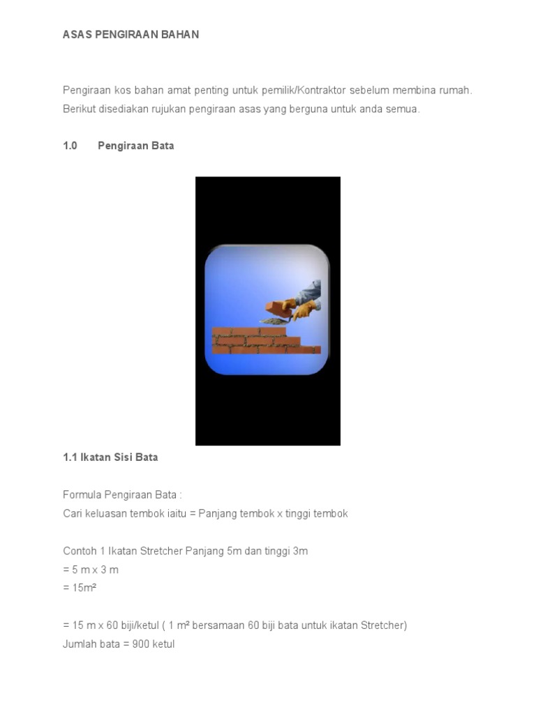 Pengiraan bahan bangunan adalah yang perlu dilakukan oleh seorang yang bernama QS CARA-CARA MEMBUAT ANGGARAN. Apabila anda dan keluarga anda untuk membina rumah perlu tahu cara pengiraan bahan binaan rumah. 0 ratings 0 found this document useful 0 votes 318 views 7 pages.
